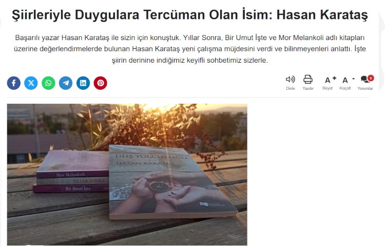 Başarılı yazar Hasan Karataş ile sizin için konuştuk. Yıllar Sonra, Bir Umut İşte ve Mor Melankoli adlı kitapları üzerine değerlendirmelerde bulunan Hasan Karataş yeni çalışma müjdesini verdi ve bilinmeyenleri anlattı. İşte şiirin derinine indiğimiz keyifli sohbetimiz sizlerle.
